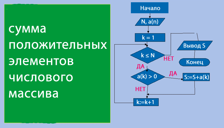 Вычислить сумму положительных элементов числового массива А = (а1, а2, ..., аN)