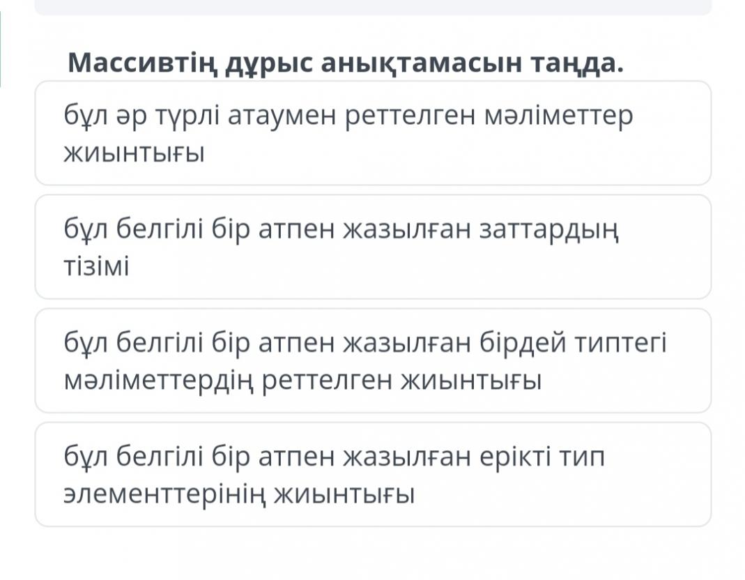 1. бұл белгілі бір атпен жазылған бірдей типтегі мәліметтердің реттелген жиынтығы