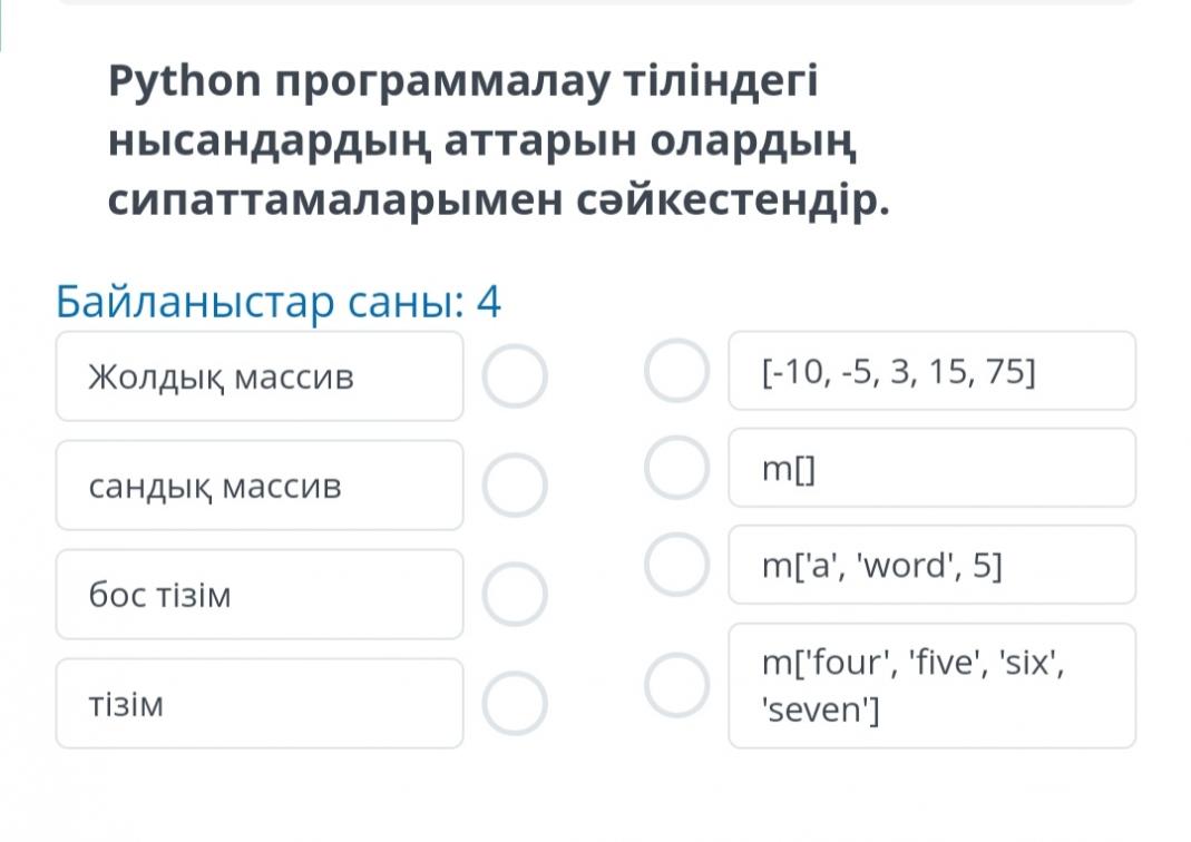 Python программалау тіліндегі нысандардың аттарын олардың сипаттамаларымен сәйкестендір.