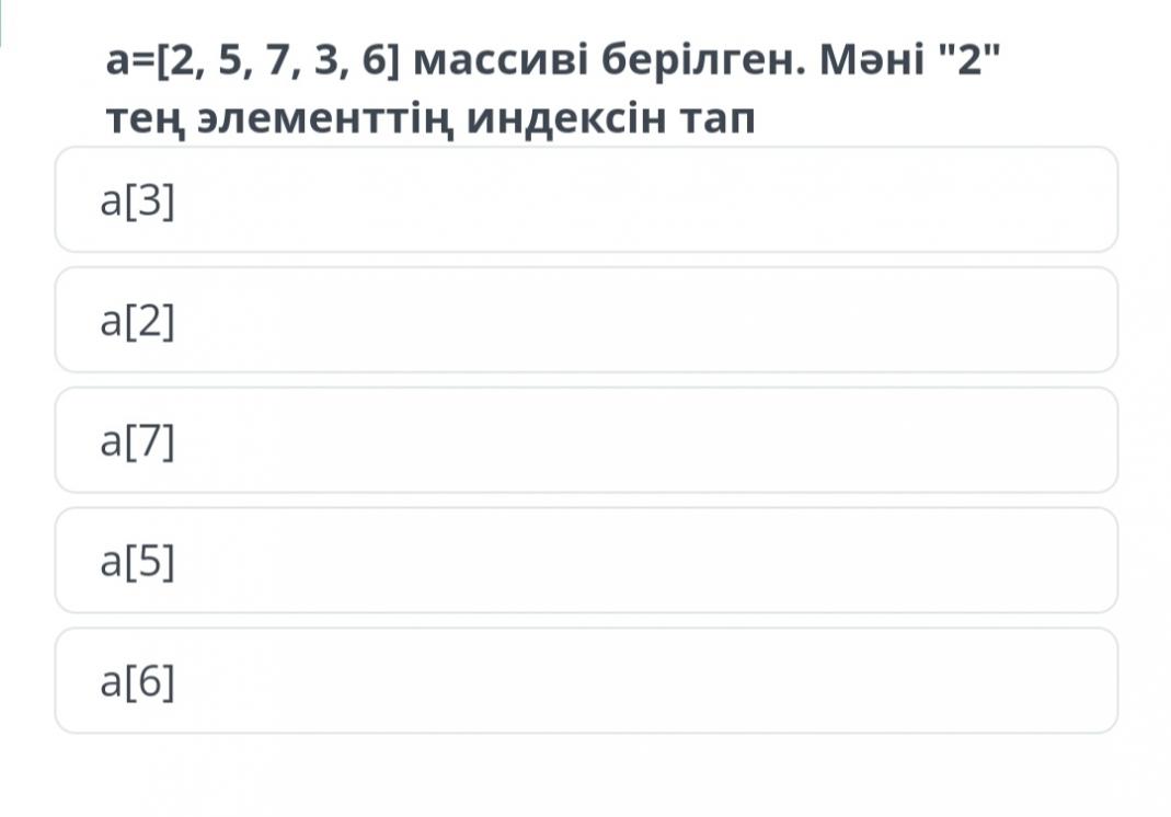 a=[2, 5, 7, 3, 6] массиві берілген. Мәні "2" тең элементтің индексін тап