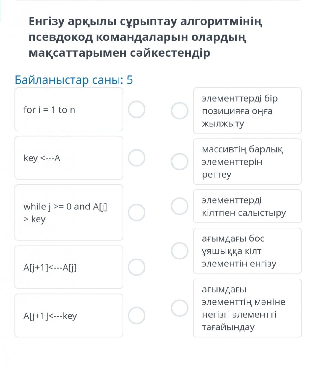 Енгізу арқылы сұрыптау алгоритмінің псевдокод командаларын олардың мақсаттарымен сәйкестендір