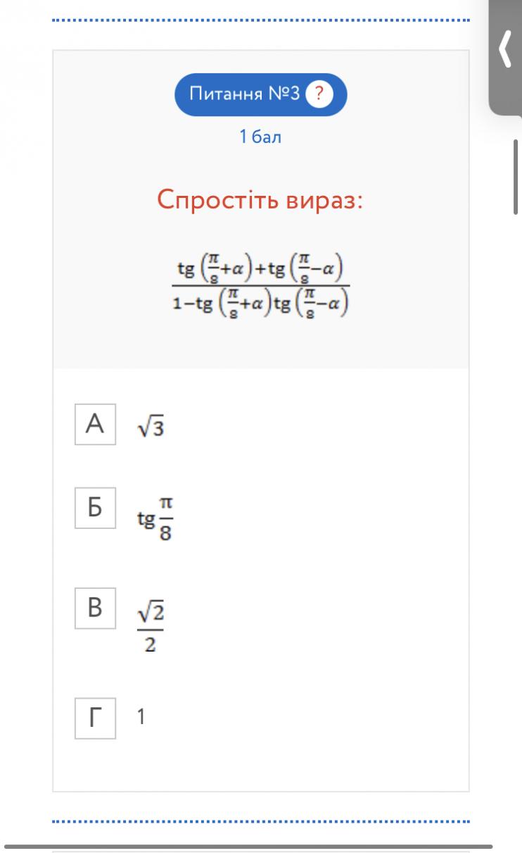 (tg(π/8 + α) + tg(π/8 - α))/(1-tg(π/8 + α)tg(π/8 - α))