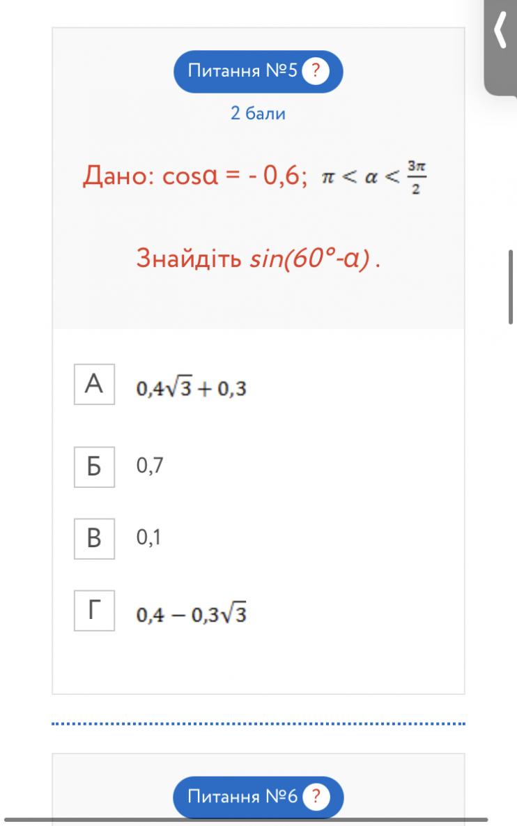 cosα = -0,6; π<α<3π/2