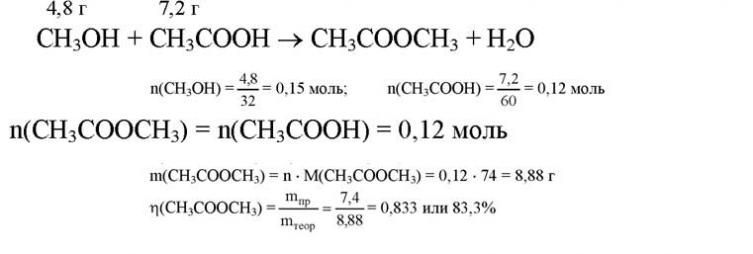 n(CH3COOCH3) = m(пр)/m(теор) = 7,4/8,88 = 0,833