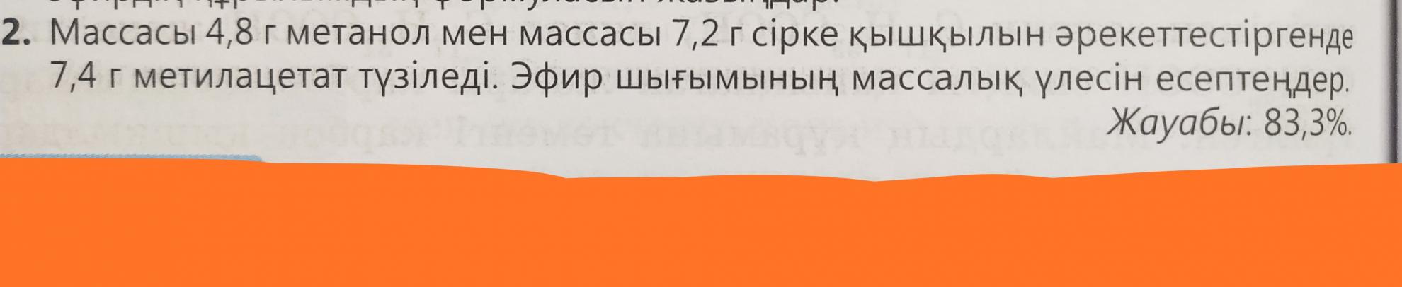 2. Массасы 4,8 г метанол мен массасы 7,2 г сірке қышқылын әрекеттестіргенде 7,4 г метилацетат түзіледі. Эфир шығымының массалық үлесін есептеңдер. Жауабы: 83,3%.