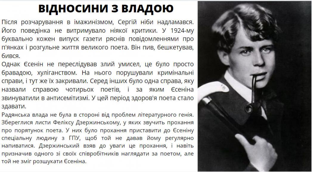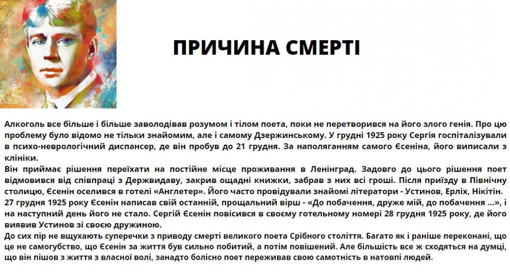 Поезію Єсеніна знають і люблять у всьому світі. Він один з найбільших поетів, подарованих нам Срібним століттям, життя якого обірвалося на злеті.