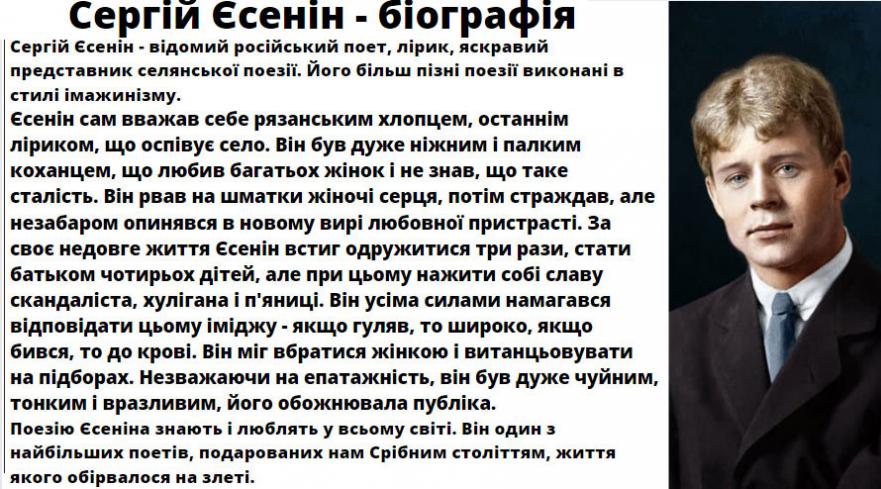 Сергій Єсенін - відомий російський поет, лірик, яскравий представник селянської поезії. Його більш пізні поезії виконані в стилі імажинізму.