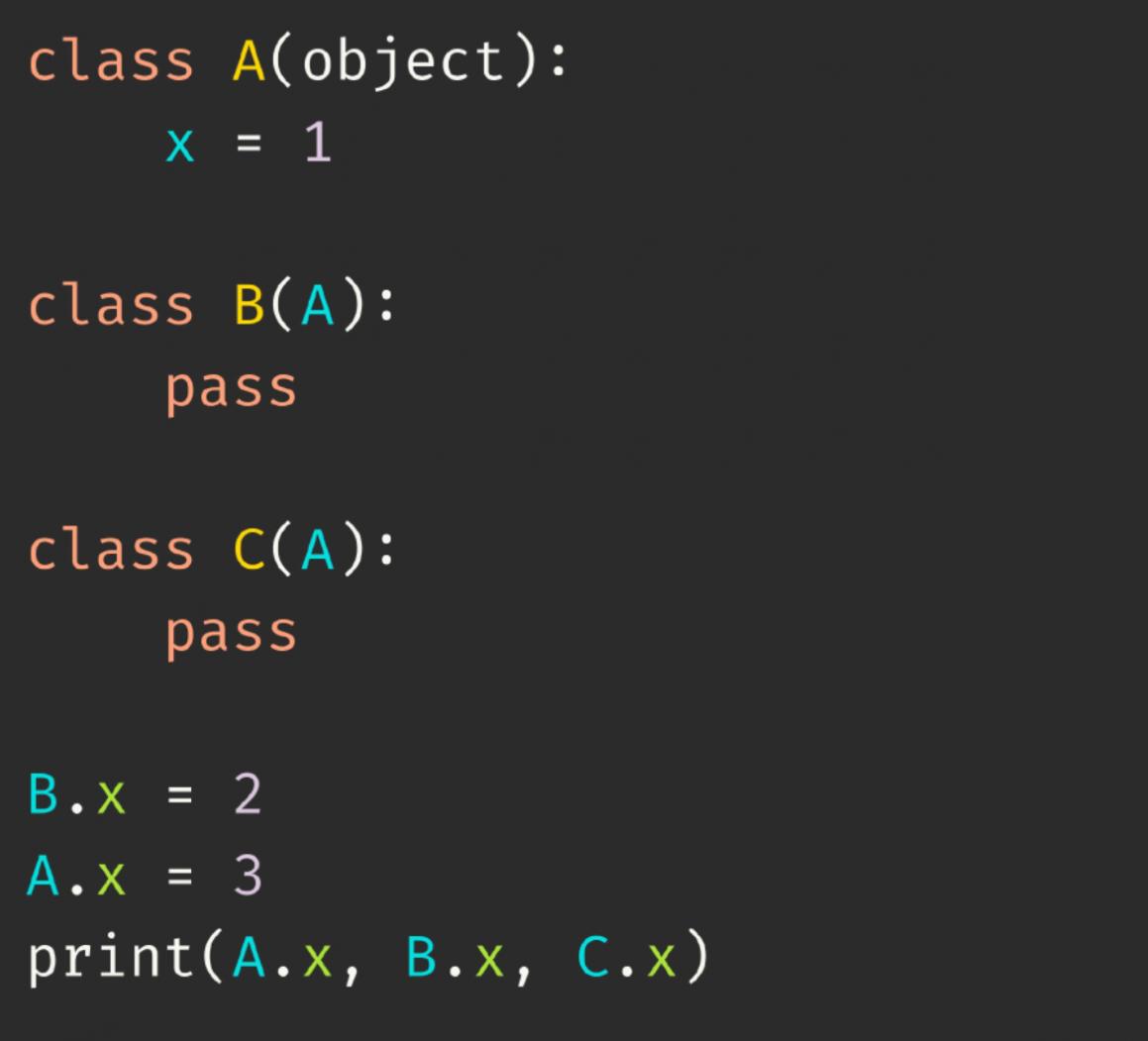 A.x = 3 print(A.x, B.x, C.x)
