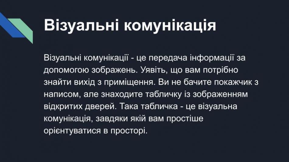 Візуальні комунікації - це передача інформації за допомогою зображень. Уявіть, що вам потрібно знайти вихід з приміщення. Ви не бачите покажчик з написом, але знаходите табличку із зображенням відкритих дверей. Така табличка - це візуальна комунікація, завдяки якій вам простіше орієнтуватися в просторі.