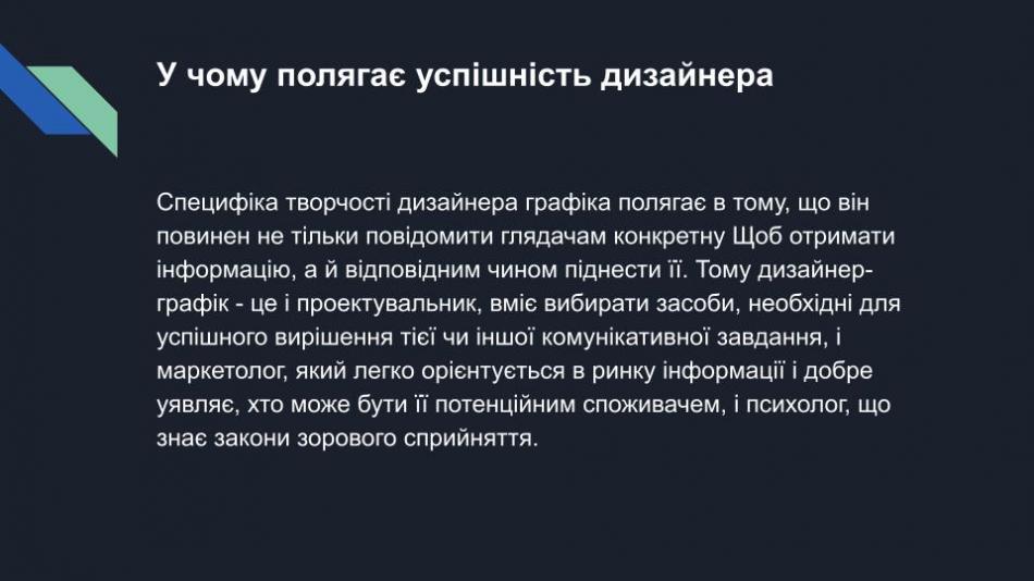 Специфіка творчості дизайнера графіка полягає в тому, що він повинен не тільки повідомити глядачам конкретну Щоб отримати інформацію, а й відповідним чином піднести її. Тому дизайнер-графік - це і проектувальник, вміє вибирати засоби, необхідні для успішного вирішення тієї чи іншої комунікативної завдання, і маркетолог, який легко орієнтується в ринку інформації і добре уявляє, хто може бути її потенційним споживачем, і психолог, що знає закони зорового сприйняття.